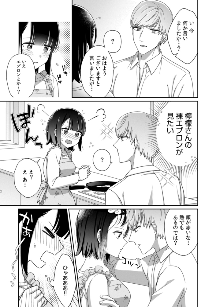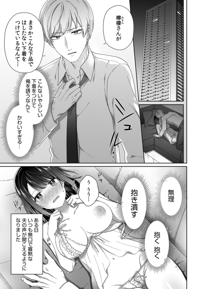 【電子書店、描き下ろしイラスト1P収録】「抱く、抱く、抱き潰す」ある日、無口で寡黙な夫の声が聞こえるようになりました。私たちは結婚1か月目の夫婦。夫の大地さんは家柄も良く、眉目美麗、文武両道、学生時代からの憧れの人。なのに、結婚式から1か月、私たちは未だに初夜を迎えていません。素敵だけど無口な大地さん、何を考えているか悩んでいる時に、こけて頭を打ったら、心の声が聞こえるようになりました。「俺の奥さんは本当に可愛いな」「檸檬さんの裸エプロンが見たい」「なんだこの可愛い生き物は○すぞ? 良いのか? ○すぞ!!」大地さんのイメージとはちょっと違うセリフもありましたが、大地さんもその気だと分かり、私もその気になり、ちょっとHな下着をつけて、結婚1か月目の夜を待ちました。でも、その日は大地さんの帰りが遅くて…!?