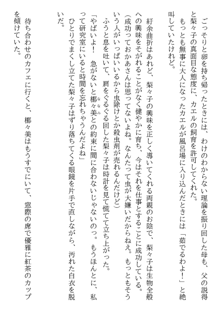 反根梨々子は日本で指折りの化学メーカーで、殺虫剤の開発をしている。彼女は双子の妹・梛々美がモデルをしているほどの美しい容姿の持ち主だが、身の回りのことに無頓着で、日夜研究対象の“蚊”のことばかり考えているリケジョだった。そんなある日、梛々美が事故で怪我を負い、急きょその身代わりとして仕事に行くことに。しかし、にわか仕込みで身なりを整え挑んだ撮影は、梨々子が勤める企業のライバル会社ギンリンのTVCMだった。なんとか撮影スタッフの目はごまかせた梨々子だったが、ギンリンの御曹司で次期社長といわれる銀林虎之進は、オーディションの時と様子の違う偽の梛々美に疑惑の目を向け…。恋に奥手な梨々子と、恋に失望していた虎之進の、不器用で一途な恋の物語。