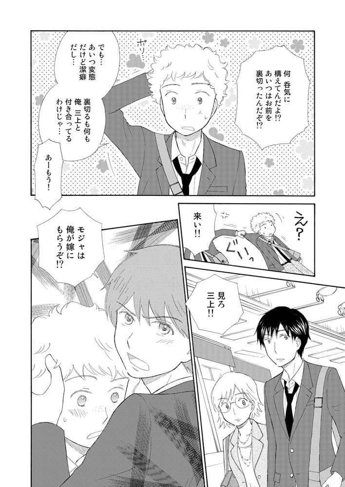 土屋建は天然パーマがコンプレックスなジミメン男子。愛称は「モジャ」。男子校のアイドルで、女装が似合う類州智也と仲が良いが、最近類州のことが女の子のように見えてきてドキドキしている。ところがそんな二人の前に、成績優秀・眉目秀麗と評判の王子様・三上悟が現れた。二人が一緒にいると邪魔ばかりしてくる三上に、さてはこいつも類州が好きなんじゃと疑う建。しかし、三上が好きなのは…。