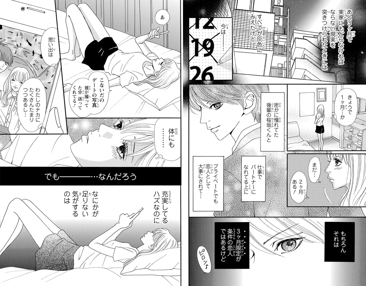 「たった3ヶ月 あっという間です。時間がないんだ 俺たちには」「セックスがダメなら恋人は解消します」特定の彼女を作る気はない、という憧れの後輩である桜坂に思い切って3ヶ月限定という条件で告白したらまさかのOKが!その日の夜からデートに誘われ、理想のデートにドキドキしてしまう。しかし、デートの後に強引に連れられたのは、まさかのホテル!? 3ヶ月しかないからと無理矢理迫られ、彼は舌を激しく絡ませて、熱くて硬いモノを押しつけてきて…。桜坂は、完全な恋人関係を続けるにはセックスが必要だという彼を受けいれる佐和子だが…!?