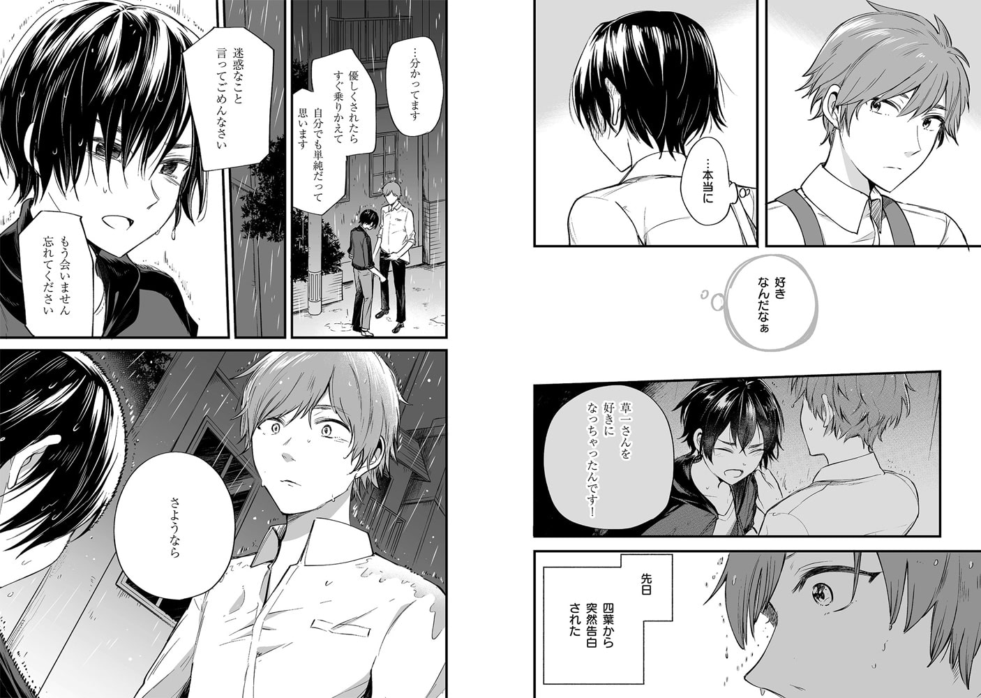 雨の日、車に轢かれそうになったところを助けてくれた草一に四葉は自分がゲイであること、好きな子に彼女ができて落ち込んでいることを告げてしまう。