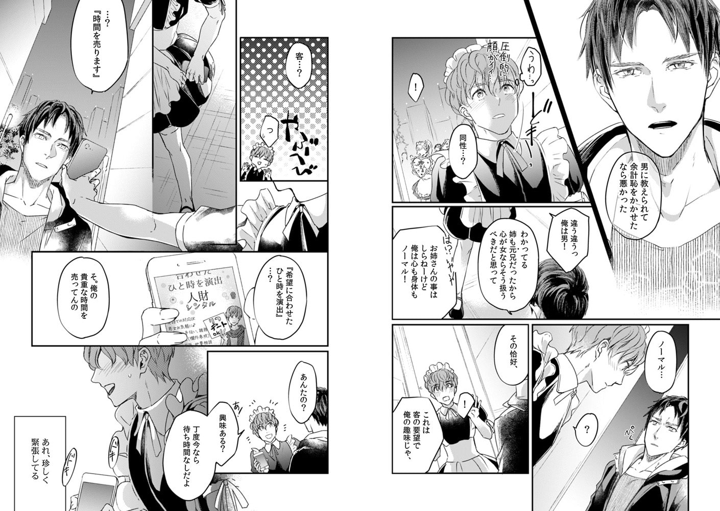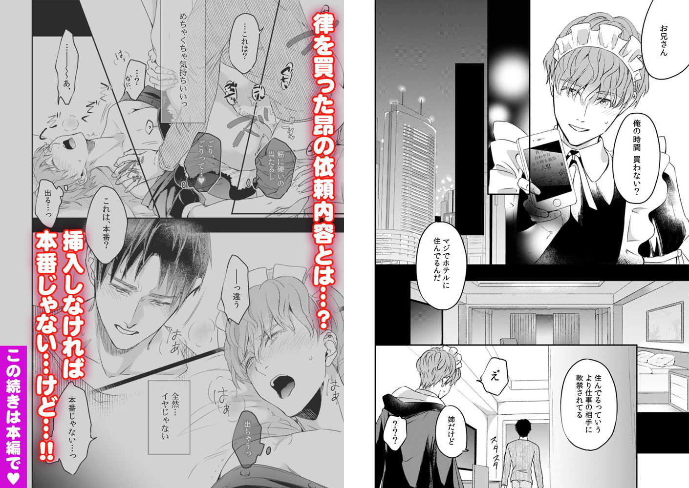 お金のためなら本番セックス以外は何でもやる律(りつ)は、ある夜、客にセックスを強要されて逃げだしてきたところに、イケメンだけど目つきは悪くて無愛想な昂(こう)と出会う。なりゆきで昂に買われた律が連れてこられたのは、とあるホテルの一室。そこで着ていた服を一枚ずつ脱ぐように指示される。昂の熱い視線を感じながら、じょじょにエスカレートする要求に応えていくと、律の股間は勃起し…。「これはセックスじゃないから大丈夫」――律は自身にそう言い聞かせていたのに、下半身には昂の高ぶりを押し付けられて…!? 本番NGなのに、このままじゃ、挿入っちゃう…!