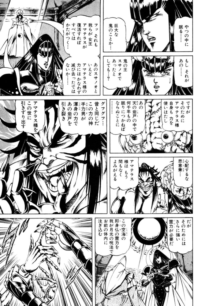 天照復活を目論む天津神が、裏高野を支配する!! 孔雀は、捉えられた日光を助けにむかうが、そこには怪力無双の天津神・天手力男神(あまのたぢからおのかみ)が待ち受けていた。
