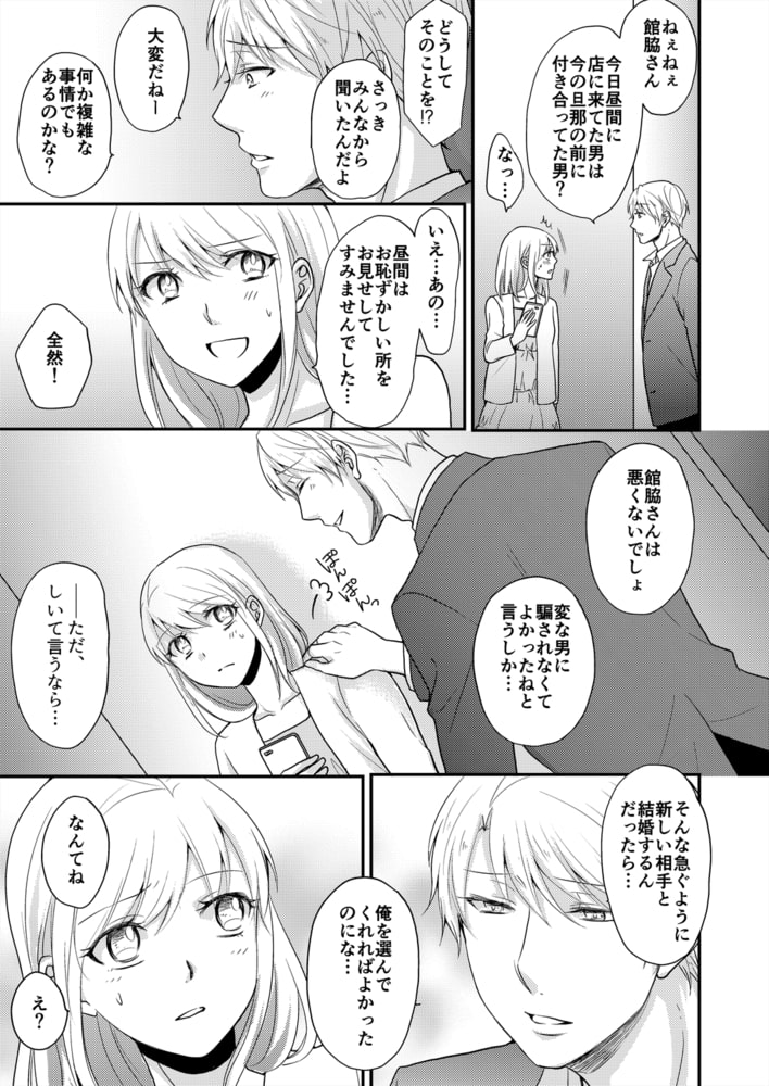 彼氏が他の女と挙式している、そんな信じられない現場を目撃した環奈。ショックで立ちすくんでいると、陸久というイケメンが優しく声をかけてくれた。彼もまた新婦の恋人だったそうで…。裏切られた者同士でヤケ酒し、いつの間にか2人ともベッドの上。「いっぱい慰めてあげますね」そう言ってキスしてくる陸久の唇は熱く…。乳首を甘噛みされ、長い指で敏感なところを弄られたらもう、気持ち良すぎて何も考えられない。さらにはトロトロに解れた奥深くに、硬いものが挿入ってきて――…!出会ったばかりの相手に、なんでこんなに感じちゃうの…?たっぷりイカされ満たされたあと、彼から驚きの提案が。「僕たち結婚しませんか?」