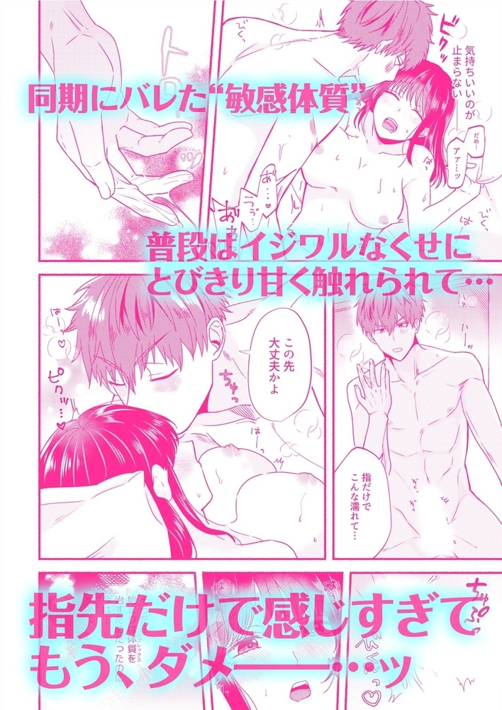 「どこが一番感じのるか教えろよ」てきぱき仕事をこなし、周りからも頼られる私・犬飼莉子。そんな私の悩みは、同期・岩佐の存在。営業成績も常にトップで仕事の出来る男なのに、いつもなにかと絡んでくる。そしてもう一つの悩み…それは少し触られただけでもビクビクと感じてしまう、この敏感体質。誰にも気づかれないよう気をつけていたのに、ある日ひょんなことから岩佐にバレちゃった!?絶対からかわれる、そう思ったのになぜか優しく触れてきて。さらには「かわいい」なんて言いながら首筋や耳を焦らすようにゆっくり撫でられたら、身体中が反応して声を抑えきれない!「触っただけですげービクビクしてるけど?」ライバル同期のいじわるな指先が、こんなに気持ちイイなんて知らなかった――!